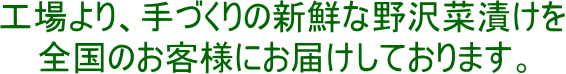 厳選された新鮮で柔らかい野沢菜のみを使用し、当社独自の減塩製法と味付けにこだわった、保存料、着色料を使用しない野沢菜本来のしゃきしゃき感と風味を最大限引き出し、さっぱりした食感をお楽しみ頂ける自慢の逸品です。