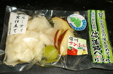 信州産さくらんぼ、桃、あんず、ぶどう、サンふじを大根とミックスしたフルーティーなデザート風のお漬物です。 |
